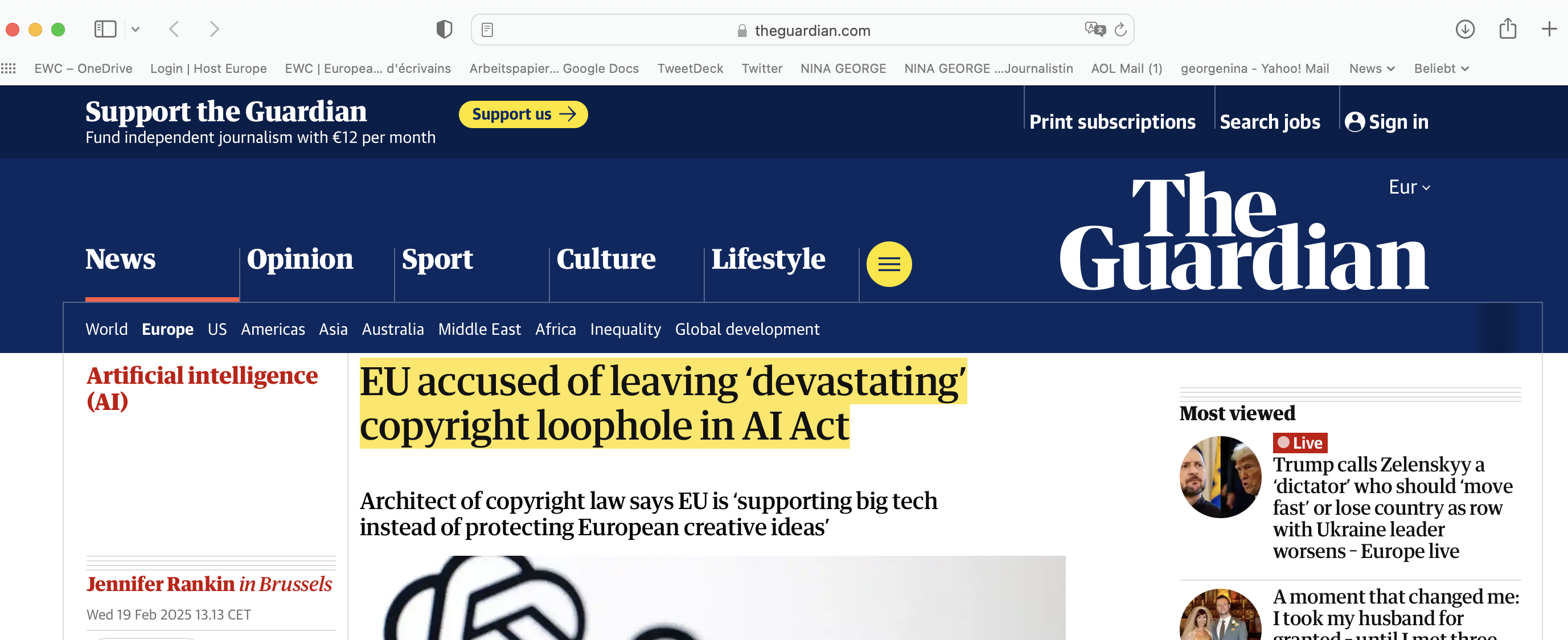 The Guardian (UK) article is dedicated to the effects of the EU AI Act and the CDSM Directive of 2019/790. In particular, it warns of the active hindrance by policymakers – including in the drafting of the Code of Practice – that makes it impossible for writers, translators, composers and other rights holders to enforce their rights against AI companies. EWC president of honour, Nina George, spoke of a fatal paradigm shift in the application and design of intellectual property rights. Meanwhile, 15 authors’, artists’, performers’ and cultural professional’s federations wrote a Joint Letter to Executive Vice-President Hanna Virkkunen, to appeal for a respectful politic towards creative individuals, who are stripped off their rights trough often non-European tech oligopolies.